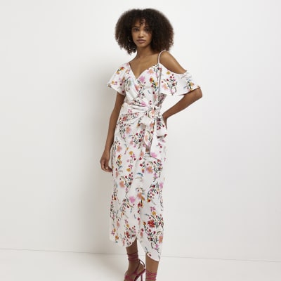 White Floral Asymmetric Wrap Midi Dress River Island