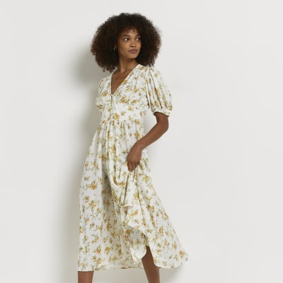 Off White Floral Puff Sleeve Midi Dress New Look